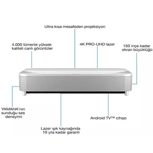 Süper ultra kısa mesafe projektör 4K PRO-UHD1 Akıllı lazer projeksiyon TV Evinizde en sevdiğiniz filmleri, oyunları ve spor müsabakalarını en büyük boyutta izleyin Akıllı eğlence Android TV4 ve YAMAHA ses kalitesi ile EpiqVision Ultra serisi Uzun ömürlü çözüm 10 yılı bulan eğlencenin tadını çıkarın² Uygun maliyetli oturma odası çözümü Duvara yakın şekilde 150 inçe kadar projeksiyon yapın Etkileyici, parlak görüntüler 4.000 lümene kadar eşit derecede yüksek Beyaz ve Renkli Işık Çıkışı